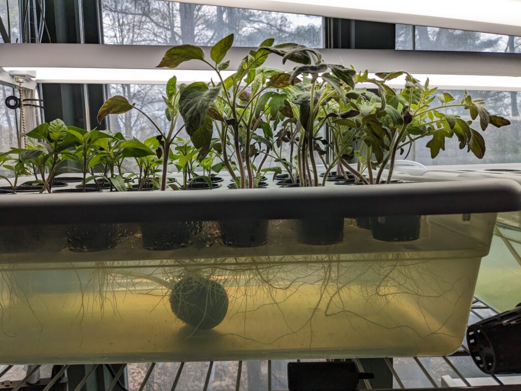 The pictures show several varieties of both peppers and tomatoes. Right now I’m pretty much treating them all the same. If you look really closely at the edge of the net pots you will see silver dots and dashes that will let me know what variety they are later.