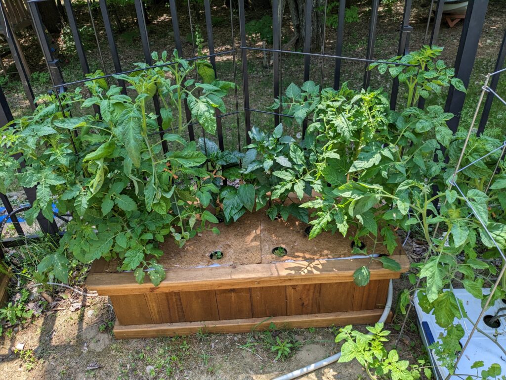 I put the peppers in the middle knowing that they will never get over 3 feet tall. I’m training the tomatoes to go outward an perhaps over so all of the plants get a similar amount of sun. The front row is currently acting as a temporary holding spot for a few tomatoes while I get another location ready for them. In the near future they will be replaced with some lower plants like lettuce and cucumbers