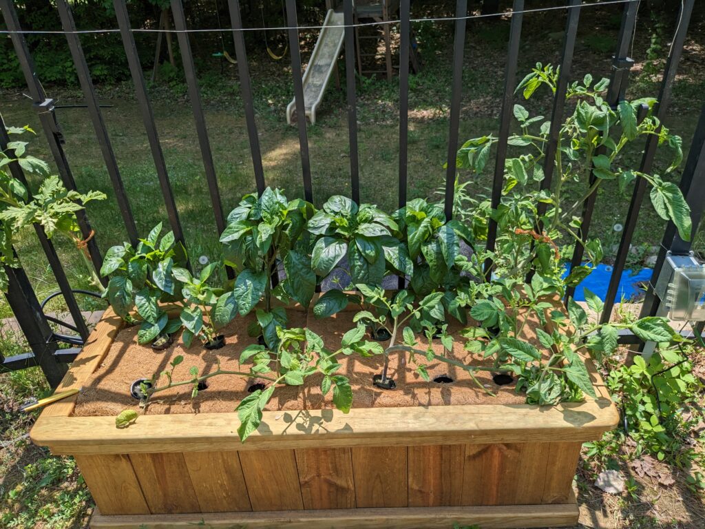 This is a 2 x 10 gallon tub system. The back row of plants are supported/trellised along a pool fence right behind the container.