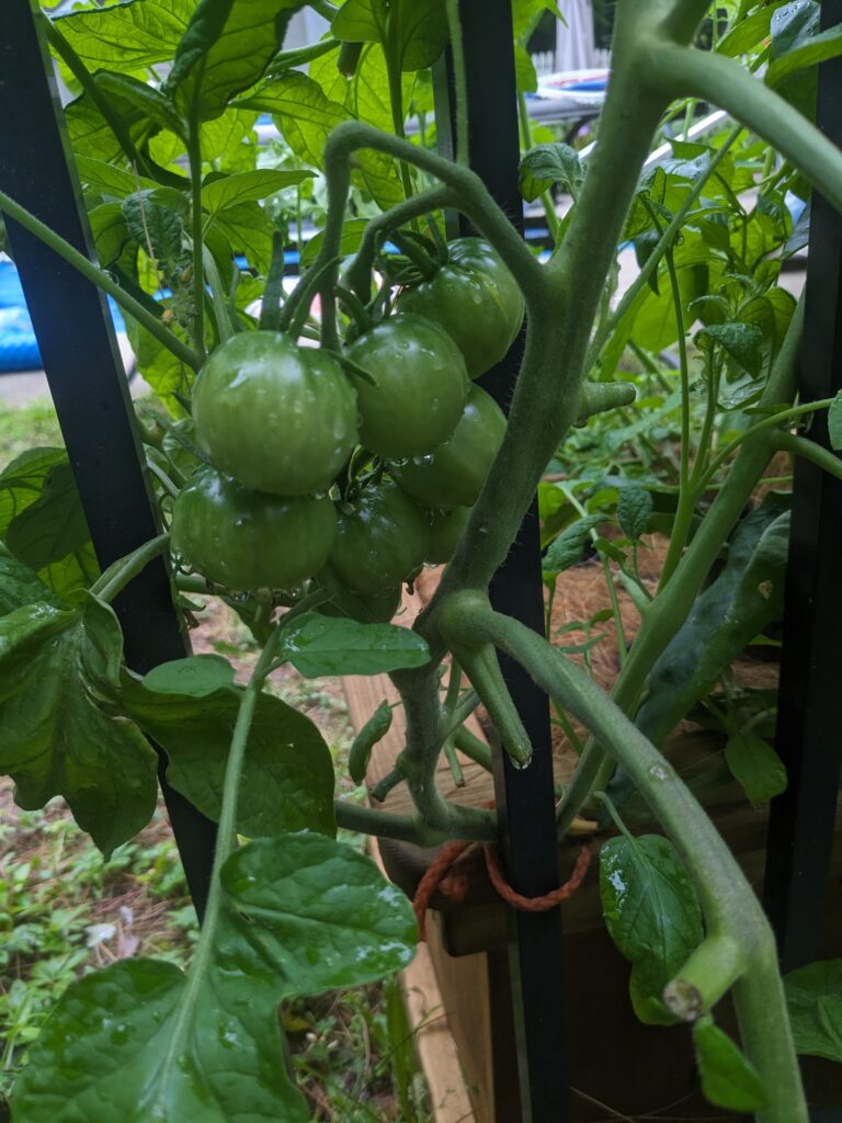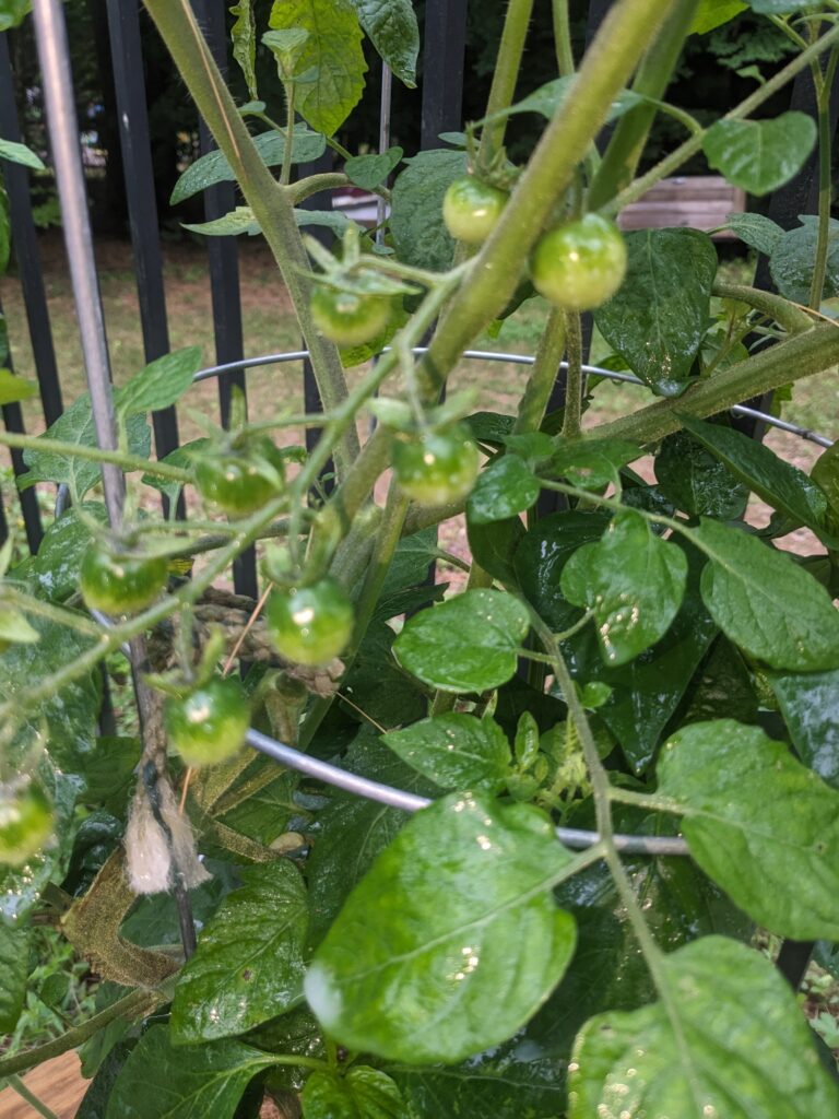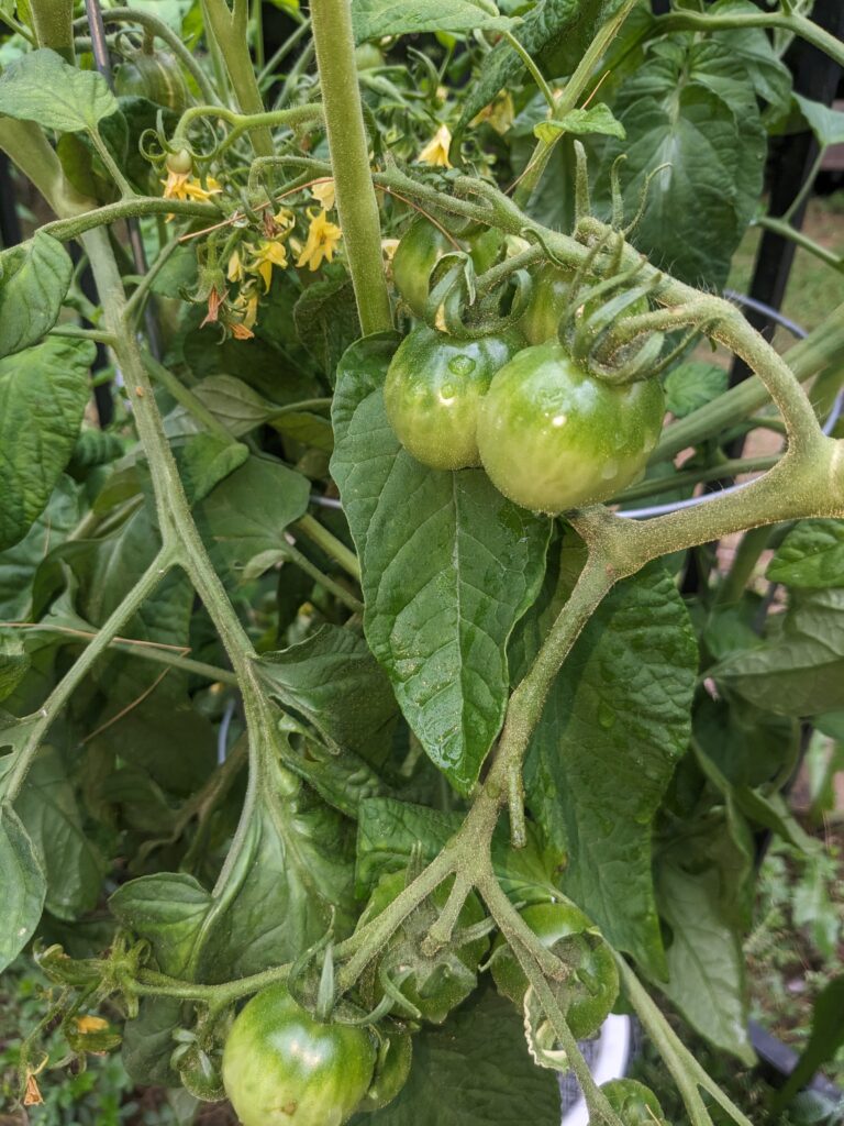 The story goes that the pollen produced in tomato flowers is unsavory to bees and other pollinating insects. But since each flower contains both male and female parts you can just shake the plant a bit to pollinate. An electric toothbrush provides just enough vibration to pollinate the flowers without damaging them.